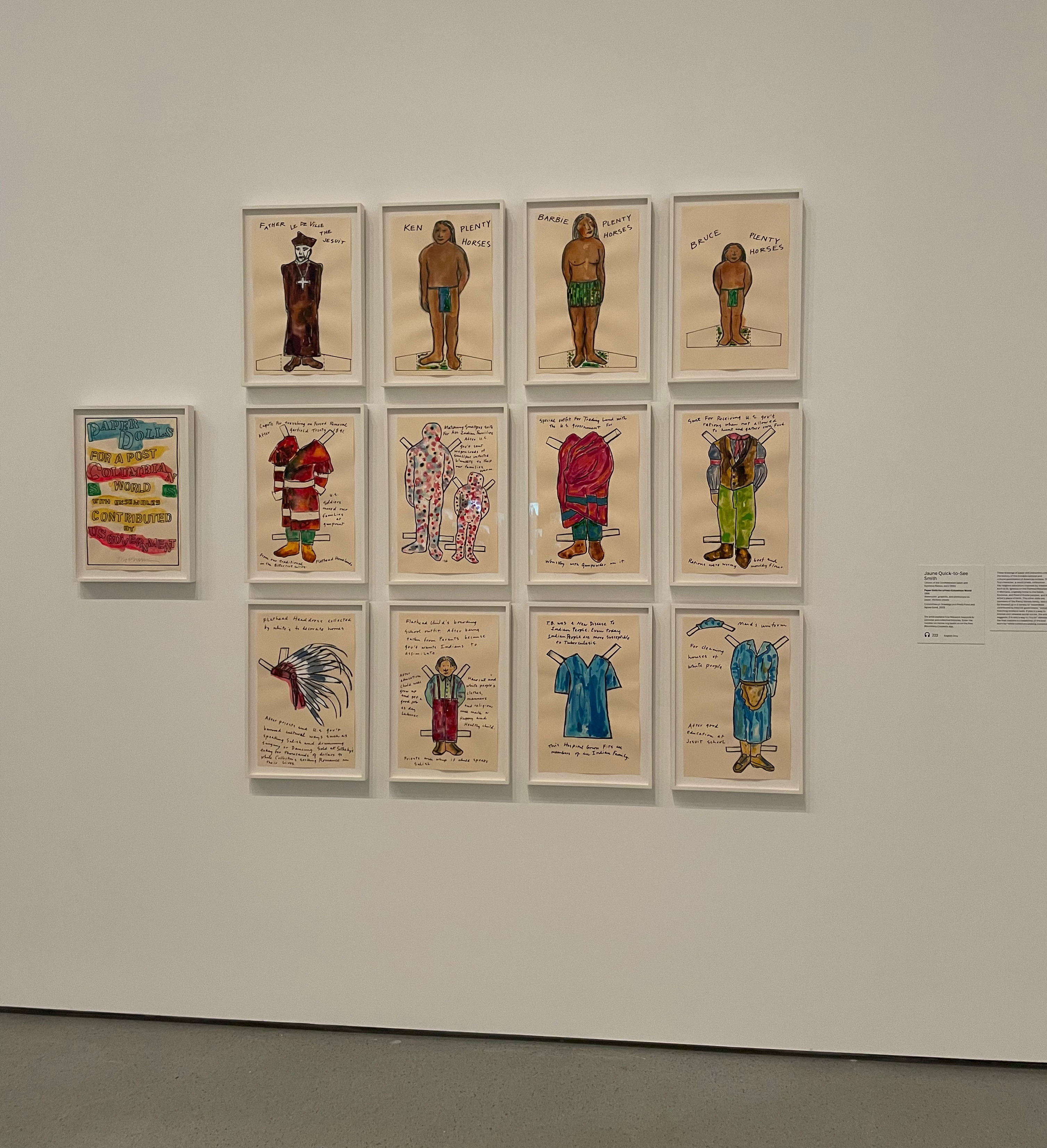 They are not the most famous of her works, but these were produced around the 500 year anniversary of Columbus’s “discovery” of the “New World,” an irony that Jaune opened up, inhabited—put on—like a paper doll, in those works that are larger than you think—larger than paper dolls, but not larger than life—pieces of paper painted with watercolors in magenta and dark purple, teal and cerulean, with skin a translucent chestnut, with skin exposed but dignified, figures outlined with charcoal, figures in the shape of a priest, a father, a mother, and a child, figures of Indian life in the late nineteenth century, figures of a time that was closer to Jaune’s birth than the span of her life, a time in which the horrors of smallpox and the Catholic Church, the horrors of forced removal and boarding schools and the erasure and assimilation of Natives was not just the norm, but the expected outcome, the responsibility of this United States, a sacred duty it took upon itself in order to save the Indians from themselves (ourselves), and in so doing, attempt to forge a continent in the image of its own deviant dreams, dreams it would deny those subjected to its colonialism, dreams it would explain (it explains so much) as the opportunity for redemption of a people only seemingly lost to history, for their irony, I want to insist, I must insist, is what allows Jaune to see in such devastation such as biting possibility of critique, a possibility for laying bare the truth, the impact, of such policies on the peoples—the government calls them wards, infantile and backwards—the peoples whose land must be stolen for this country to exist, an irony so bright, so potent, so enduring, that we are all living in the wake of its burning glory, a flame, a light that attracted so many, that supported so many, that brought to fruition the future dreams of those same ancestors depicted on a paper cut out, as if waiting to spring to life in the present, as if waiting for the right moment to remind the people not of what has been lost, but what remains to be lived, what remains, in the watery substance of a drip and a dot on a paper doll, a drop and a dot, a doll, a dream, a loving memory, a fierce, dedicated, unflinching animator of life.