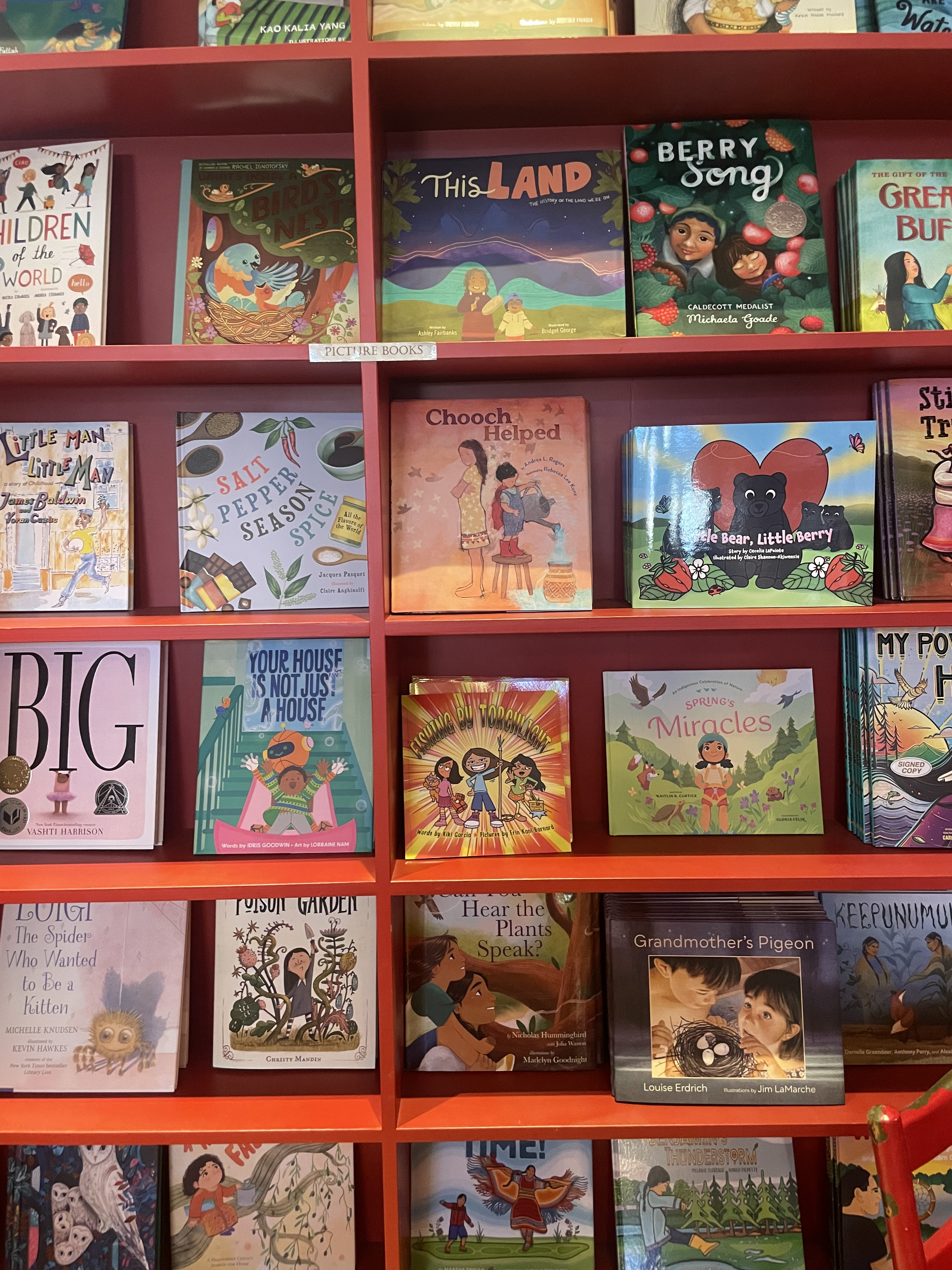 But I got emotional at the wall of children’s books. An entire wall of picture books featuring Native characters. Mostly by Native authors. I saw “Chooch Helped,” by the amazing Cherokee author Andrea Rogers, which (I’m not sure if I can say, but I’ll say: I’m translating to Spanish for the LatAm market). The book is a touching story about how a young brother always gets in the way (but his family always calls it ‘helping’) and his sister getting frustrated with it all. I’m really glad I can be of service in this way. Increasing the accessibility of our stories, via translations, is something I have advocated for in the past, so now I get to help put that advocacy to practice as well.