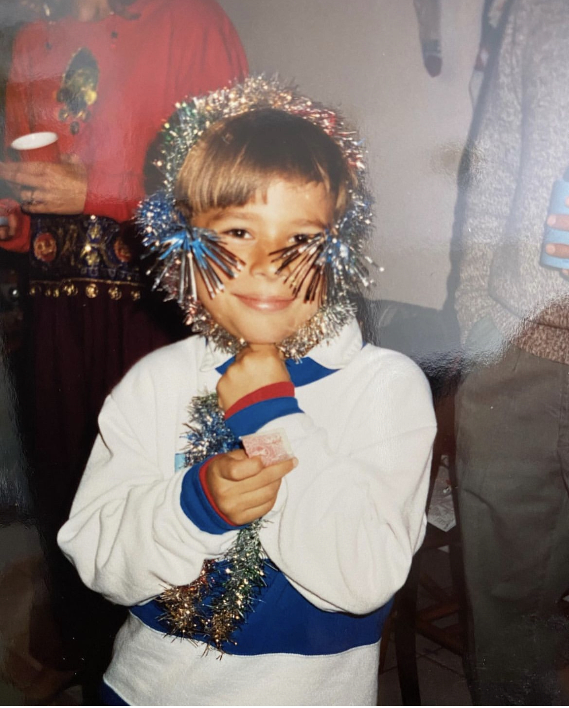 I love this me. I love how free, how unencumbered I am here. There I am holding a playing card, ripped in half, for a party game, adorned in tinsel, shining. This person is dancing. He laughs at himself, at the future me who will look back at this moment and wonder if I was ever as free as I was then. He will say, yes. He will remind me that I have always been this child, this spirited, undaunted child grinning with abandon, eyes dark and luminous.