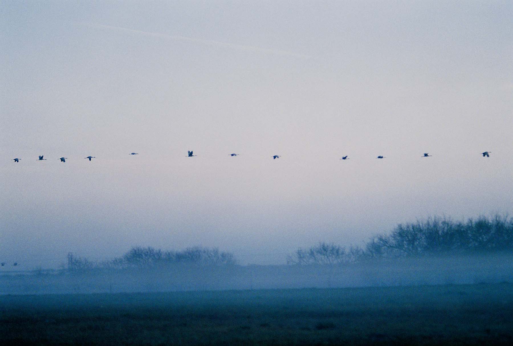 (Home. Sandhill Cranes. Fog. Mesquite trees. The fence we built but never mended.)